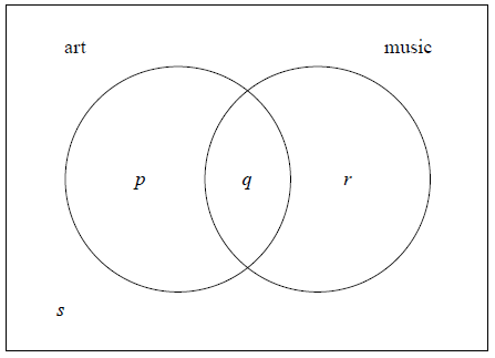In a group of 16 students, 12 take art and 8 take music. One student takes neither art nor music. The Venn diagram below shows the events art and music. The values p , q , r and s represent numbers of students.