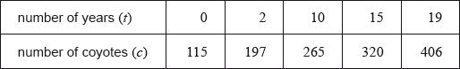 Let \(c\) be the number of coyotes in the reserve after \(t\) years. The following table shows the number of coyotes after \(t\) years.