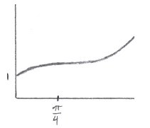 The challenge in this question is sketching the graph using the information achieved and provided. This requires students to make graphical interpretations, and as typical in section B, to link the early parts of the question with later parts. Part (a) provides the y-intercept, and part (b) gives a point with a horizontal tangent. Plotting these points first was a helpful strategy. Few understood either the notation or the concept that the function had to be increasing on either side of the \(\frac{\pi }{4}\) , with most thinking that the point was either a max or min. It was the astute student who recognized that the derivatives being positive on either side of \(\frac{\pi }{4}\) creates a point of inflexion.