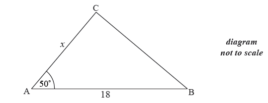 The area of triangle ABC is \(80\) cm2 , AB \( = 18\) cm , AC \( = x\) cm and \({\rm{B}}\hat {\rm{A}}{\rm{C}} = {50^ \circ }\) .