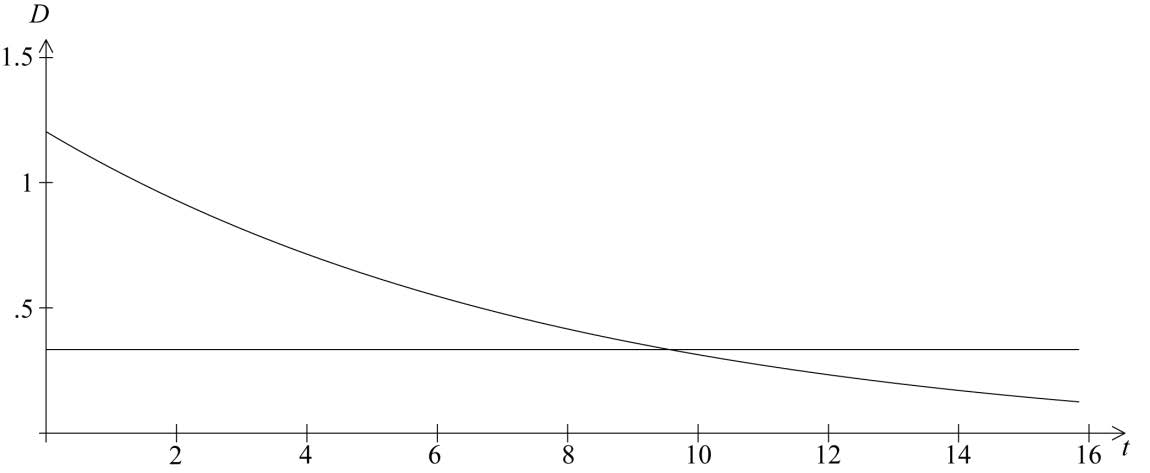where \(D\) is the amount of the drug in the bloodstream in mg per litre \({\text{(mg}}\,{{\text{l}}^{ - 1}}{\text{)}}\) and \(t\) is the time in hours.