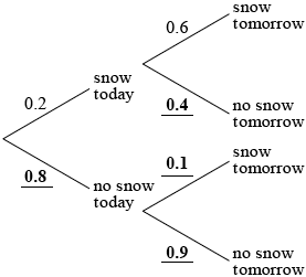 The probability that it snows today is 0.2. If it does snow today, the probability that it will snow tomorrow is 0.6. If it does not snow today, the probability that it will not snow tomorrow is 0.9.