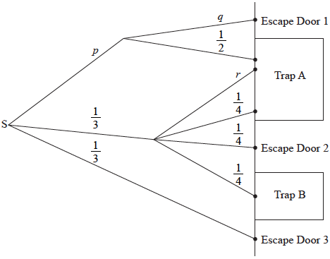 Sonya, a lab assistant, counts the number of paths that lead to traps or escape doors. She believes that the probability that Mike will be trapped is greater than the probability that he will escape.