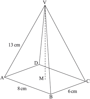 A right pyramid has apex \({\text{V}}\) and rectangular base \({\text{ABCD}}\), with \({\text{AB}} = 8{\text{ cm}}\), \({\text{BC}} = 6{\text{ cm}}\) and \({\text{VA}} = 13{\text{ cm}}\). The vertical height of the pyramid is \({\text{VM}}\).