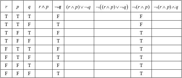 For the “\({(r \wedge p) \vee \neg q}\)” follow through from the “\(r \wedge p\)” column.
