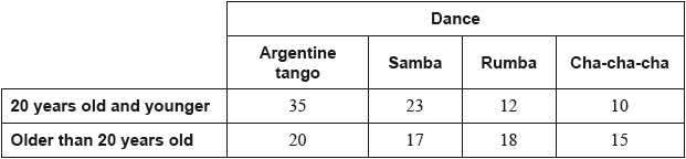 The producer of a TV dancing show asked a group of 150 viewers their age and the type of Latin dance they preferred. The types of Latin dances in the show were Argentine tango, Samba, Rumba and Cha-cha-cha. The data obtained were organized in the following table.