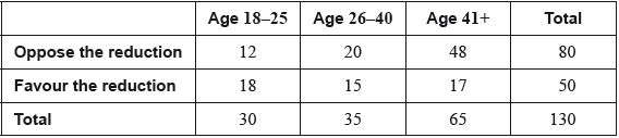 Show that the expected frequency of those between the ages of 26 and 40 who oppose the reduction in the voting age is 21.5, correct to three significant figures.