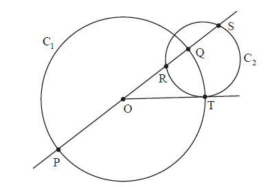 The figure shows a circle C1 with centre O and diameter [PQ] and a circle C2 which intersects (PQ) at the points R and S. T is one point of intersection of the two circles and (OT) is a tangent to C2 .