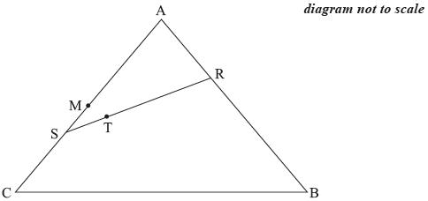 The position vectors of the points \(A\), \(B\) and \(C\) are \(a\), \(b\) and \(c\) respectively, relative to an origin \(O\). The following diagram shows the triangle \(ABC\) and points \(M\), \(R\), \(S\) and \(T\).