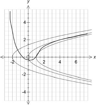 Award A1 for \(f\) not reaching \(x - {y^2} = 0\).