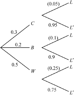 \({\text{P}}(B|L') = \frac{{{\text{P}}(L'|B){\text{P}}(B)}}{{{\text{P}}(L'|B){\text{P}}(B) + {\text{P}}(L'|C){\text{P}}(C) + {\text{P}}(L'|W){\text{P}}(Q)}}\;\;\;\left( { = \frac{{{\text{P}}(B \cap L'}}{{{\text{P}}(L')}}} \right)\) (M1)(A1)(A1)