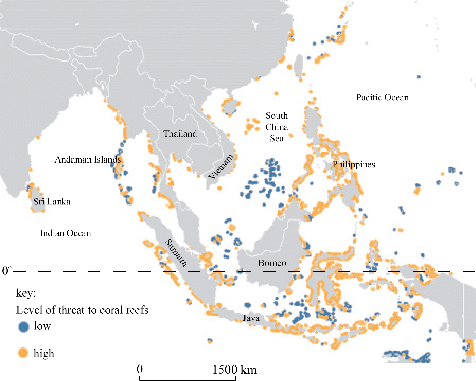 The map shows the estimated threat to coral reefs in South-East Asia.