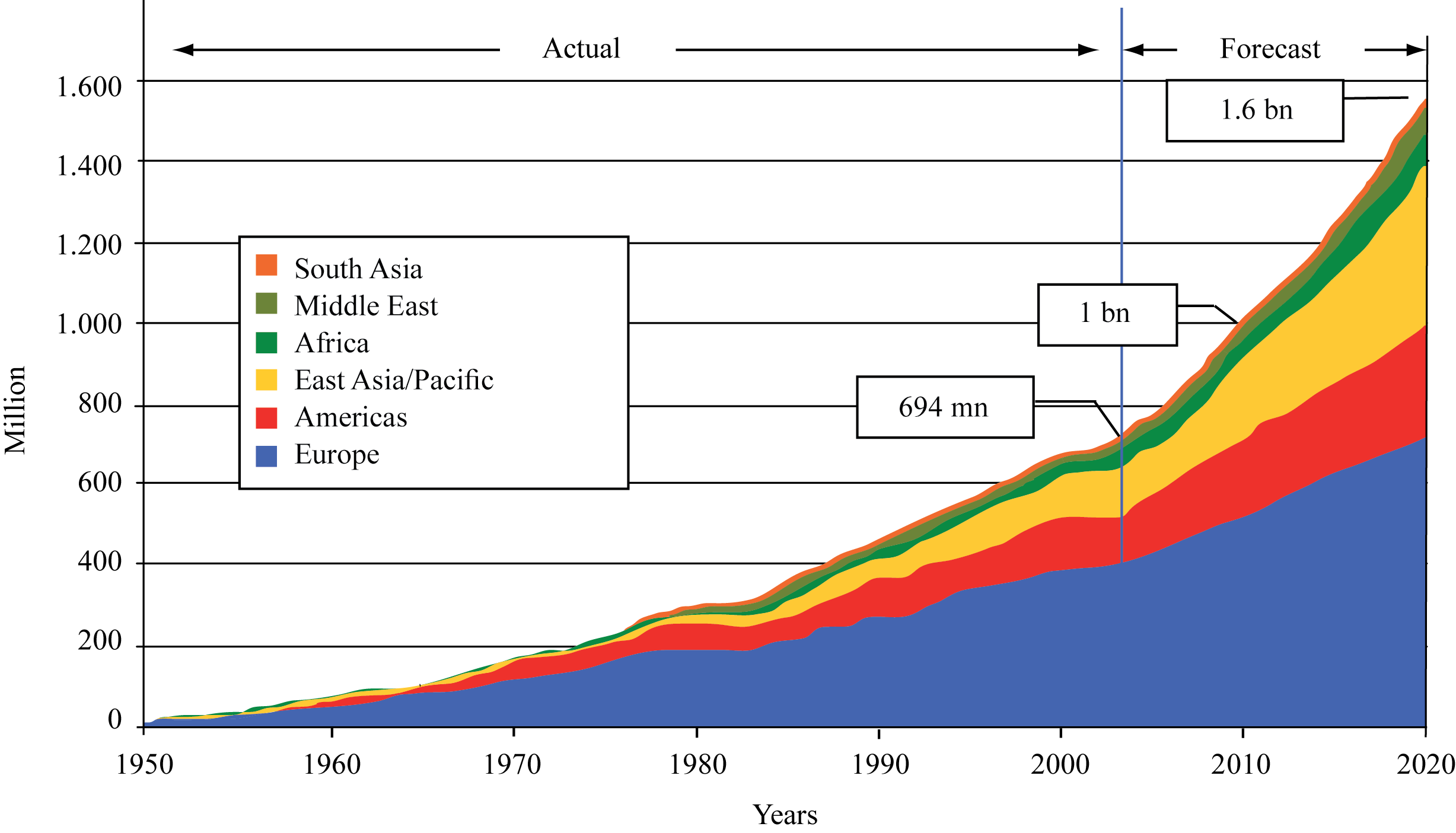 Tourism to the East Asia/Pacific region has risen rapidly and is expected to continue rising [1 mark]. Award 1 mark for either the date tourism began (about 1970) or for noting any fluctuation in the trend. Award 1 mark for any quantification.