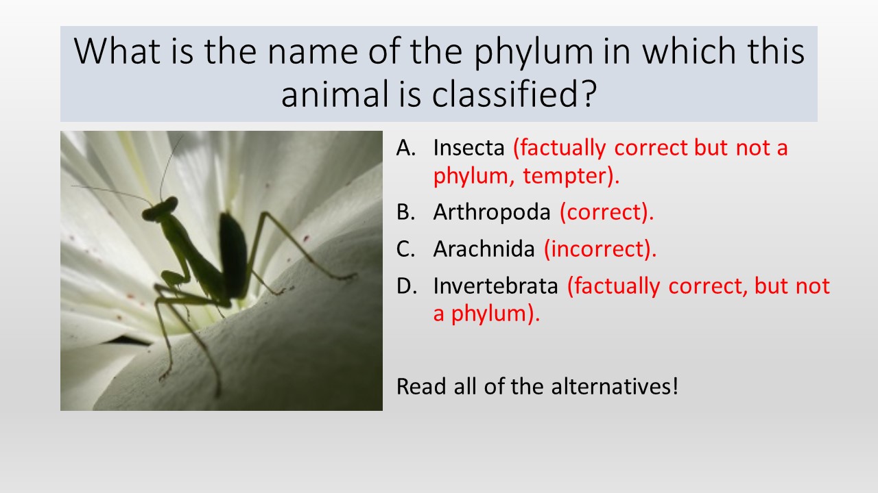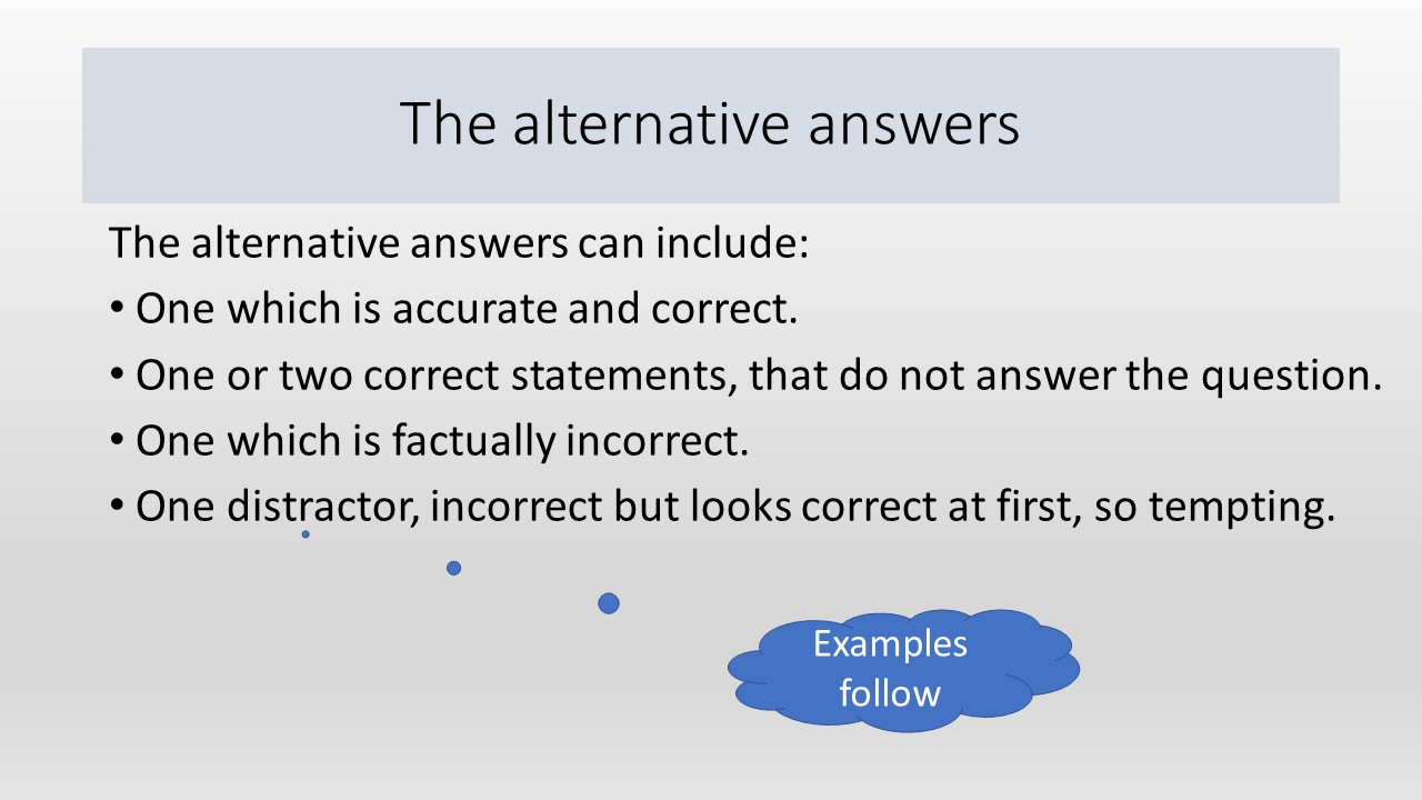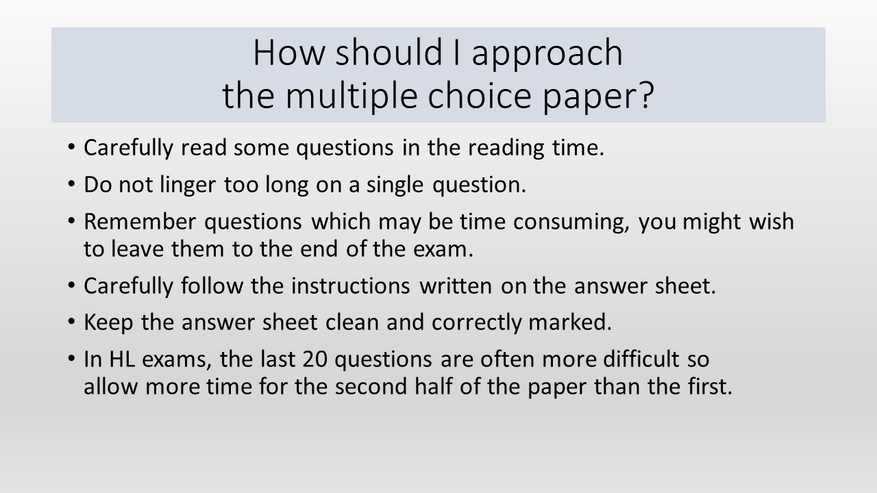 Multiple choice questions are more difficult than they look in IB exams because the examiners usually include tempting distracters amongst the choices of answers. Students who are alert to the possibility of partly correct answers will achieve higher marks.