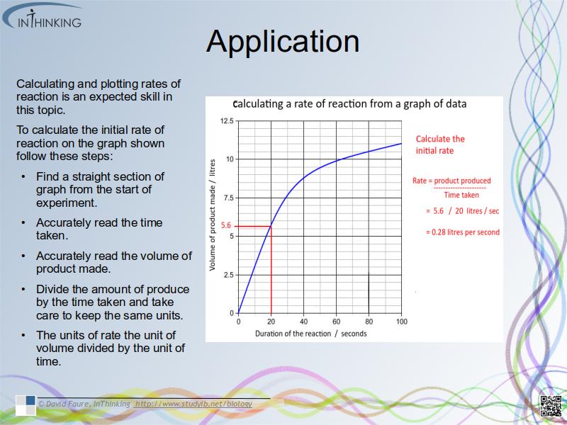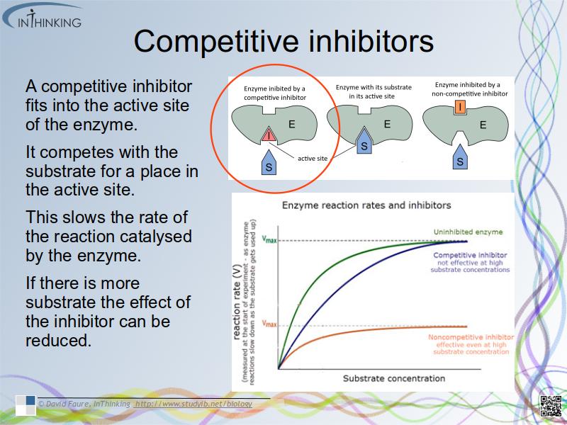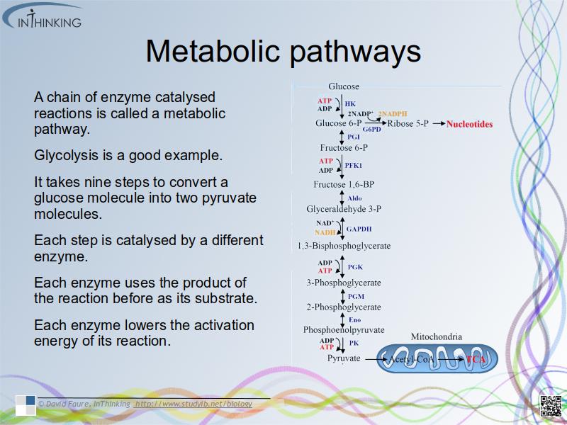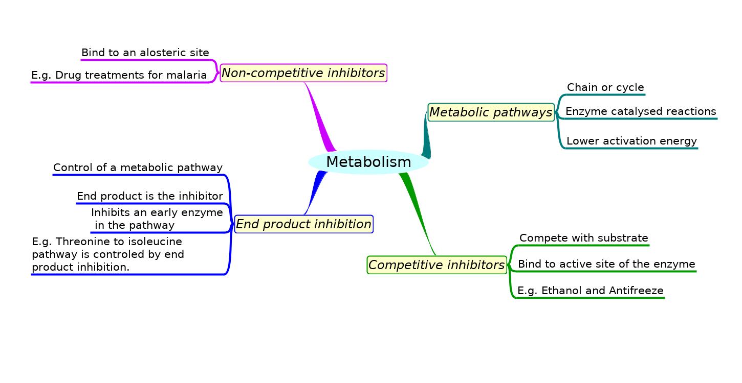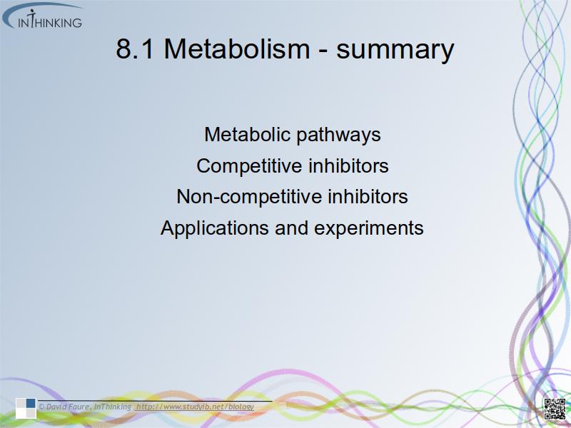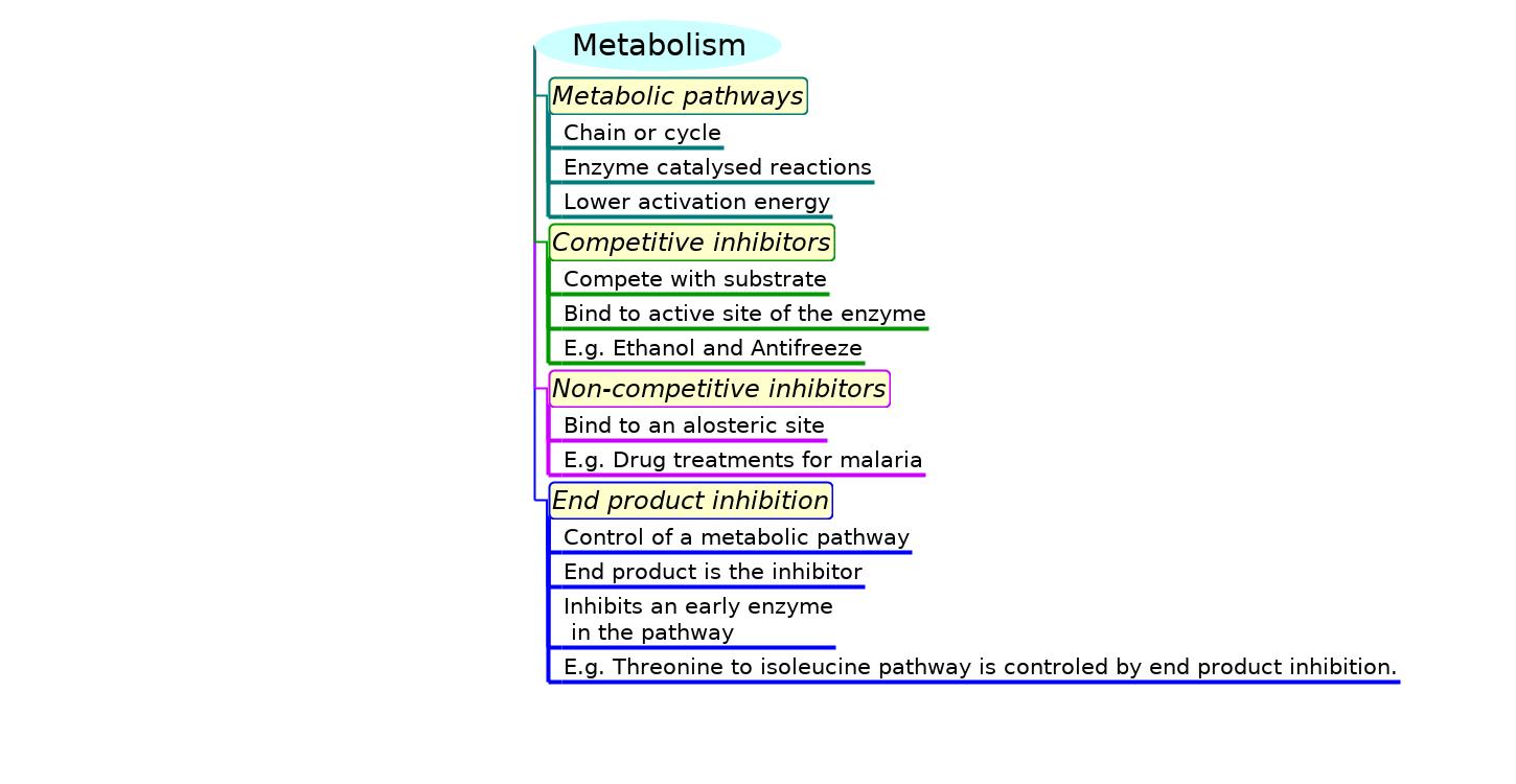 This topic covers the way enzyme pathways form a cell's metabolism as well as specific examples of these pathways. The action of enzymes and their substrates is required as well as the way in which competitive and non-competitive inhibitors change the rate of reaction. The skill of calculating a rate of reaction from a graph of data is also part of this topic.These slides summarise the essential understanding and skills in this topic.