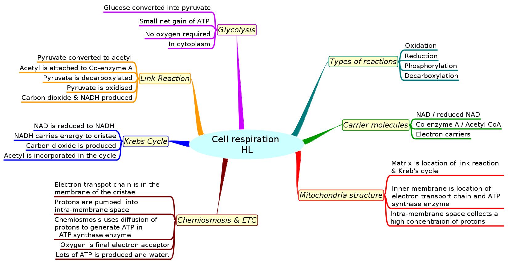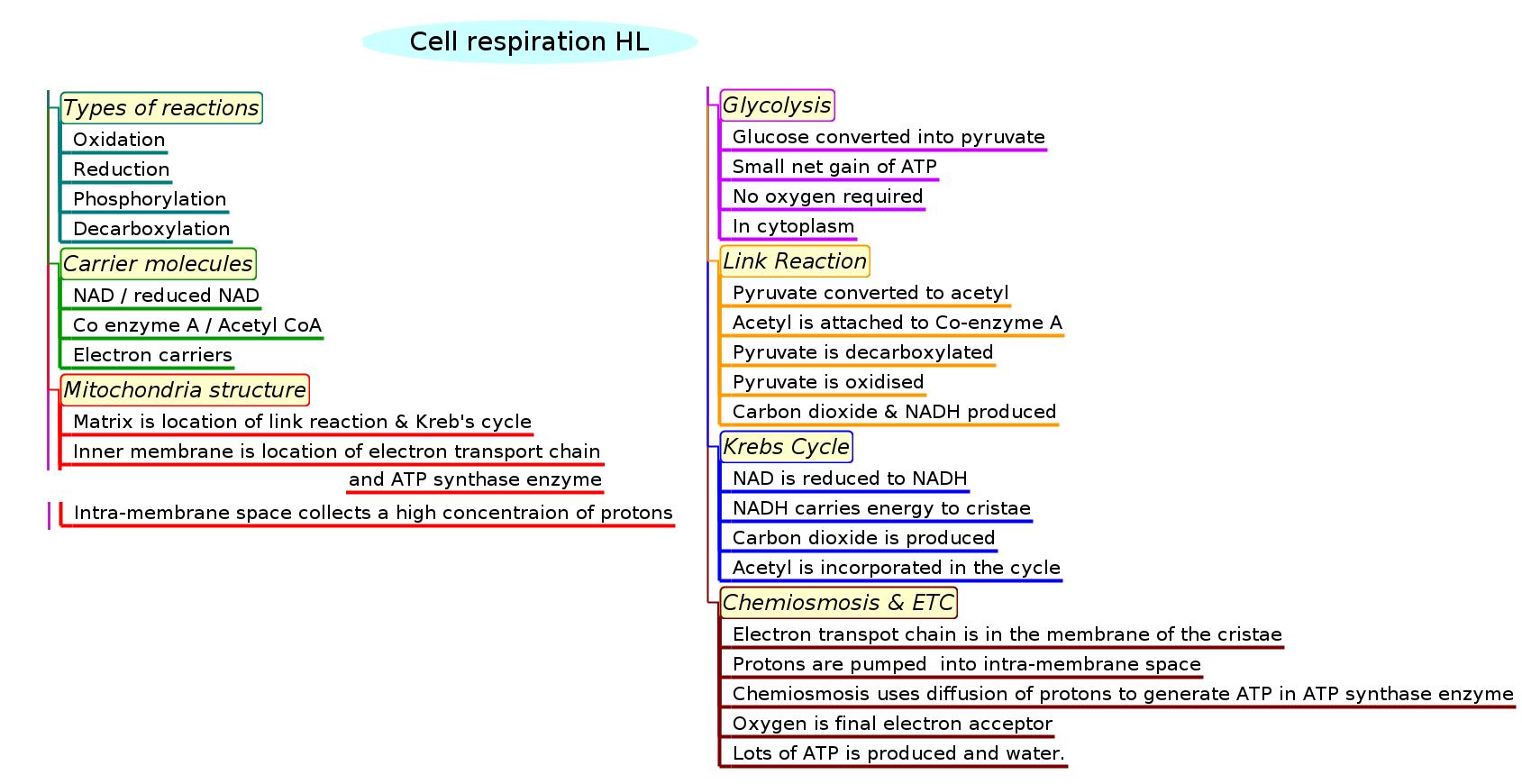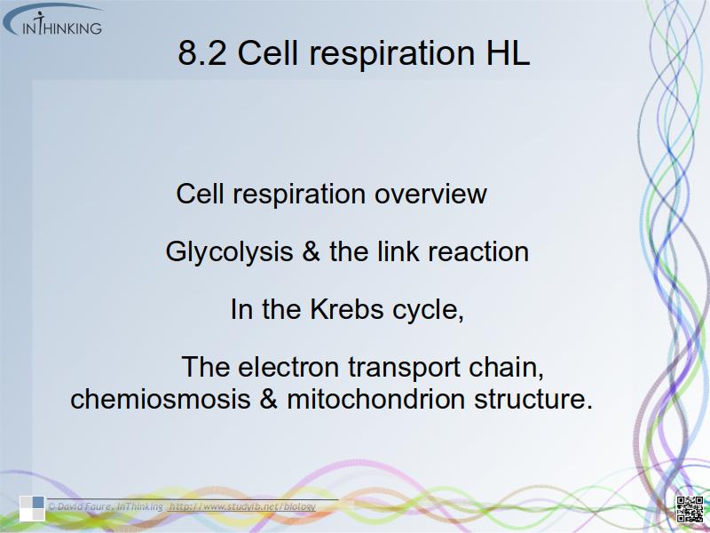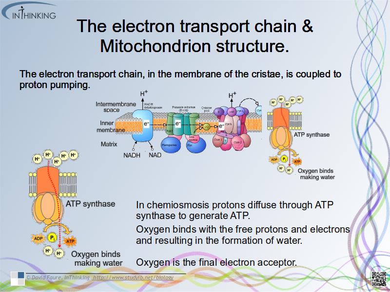 This topic looks at the details of glycolysis, the link reaction and the krebs cycle.  The structure of mitochondria is related to its function and the amazing process of chemiosmosis is outlined leading to the production of water and ATP