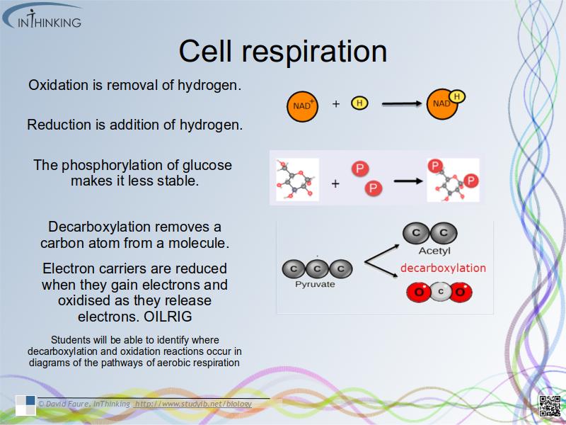 • students will be able to identify where decarboxylation and oxidation reactions occur in diagrams of the pathways of aerobic respiration.