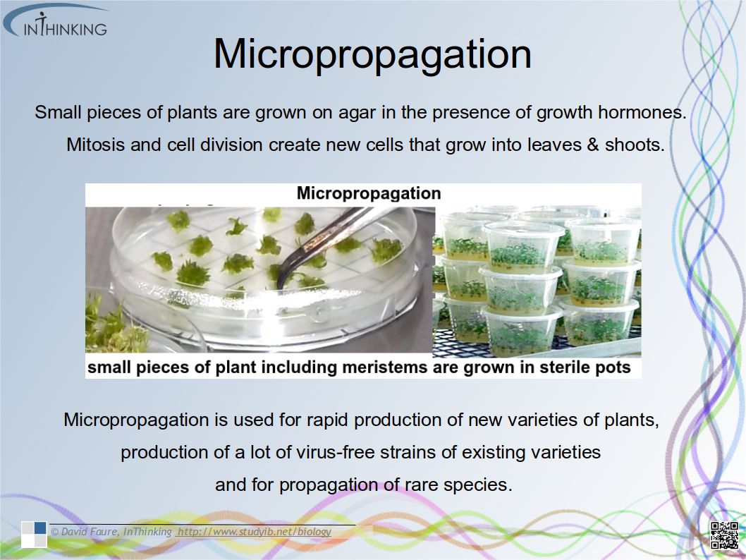 - Micropropagation of plants using tissue from the shoot apex grown on nutrient agar gels in the presence of growth hormones can be used for rapid production of new varieties, of virus-free strains of existing varieties and for propagation of orchids and other rare species.