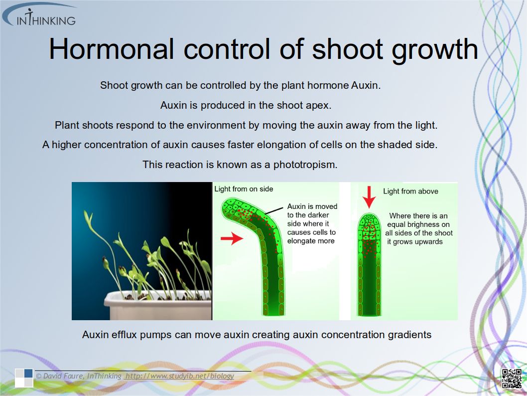 - Plant hormones (ie: auxin) control growth in the shoot apex.