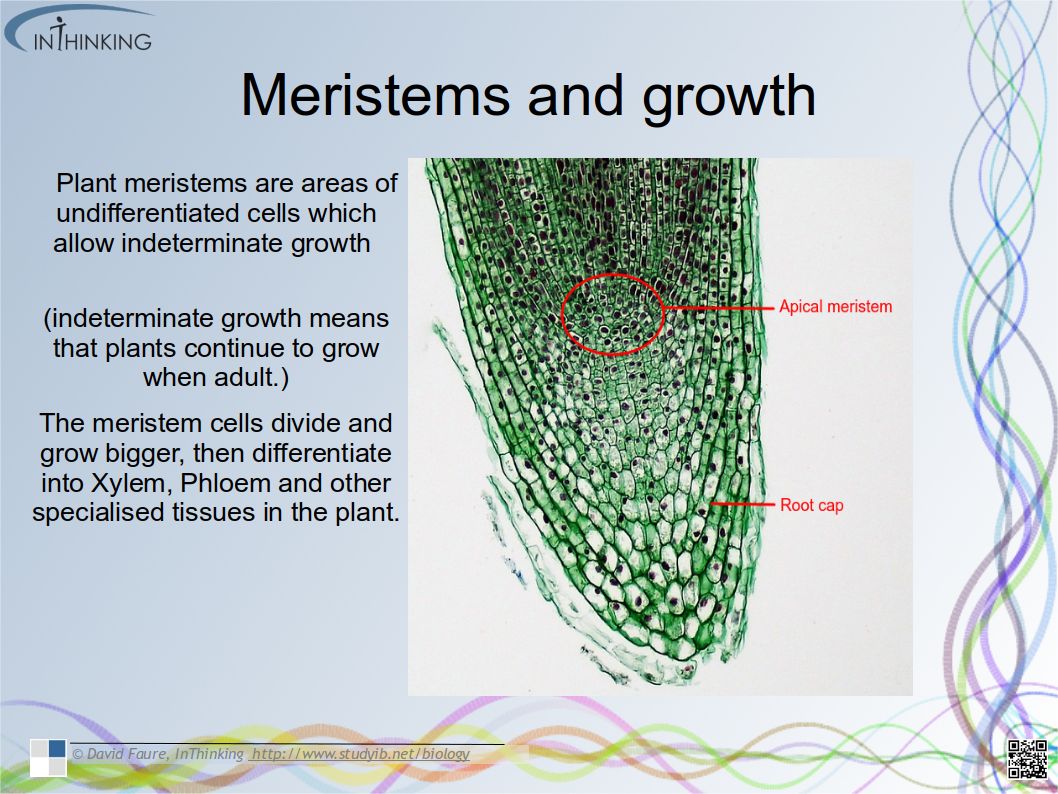 - Plant meristems are undifferentiated cells which allow indeterminate growth (ie: plants continue to grow when adult.)