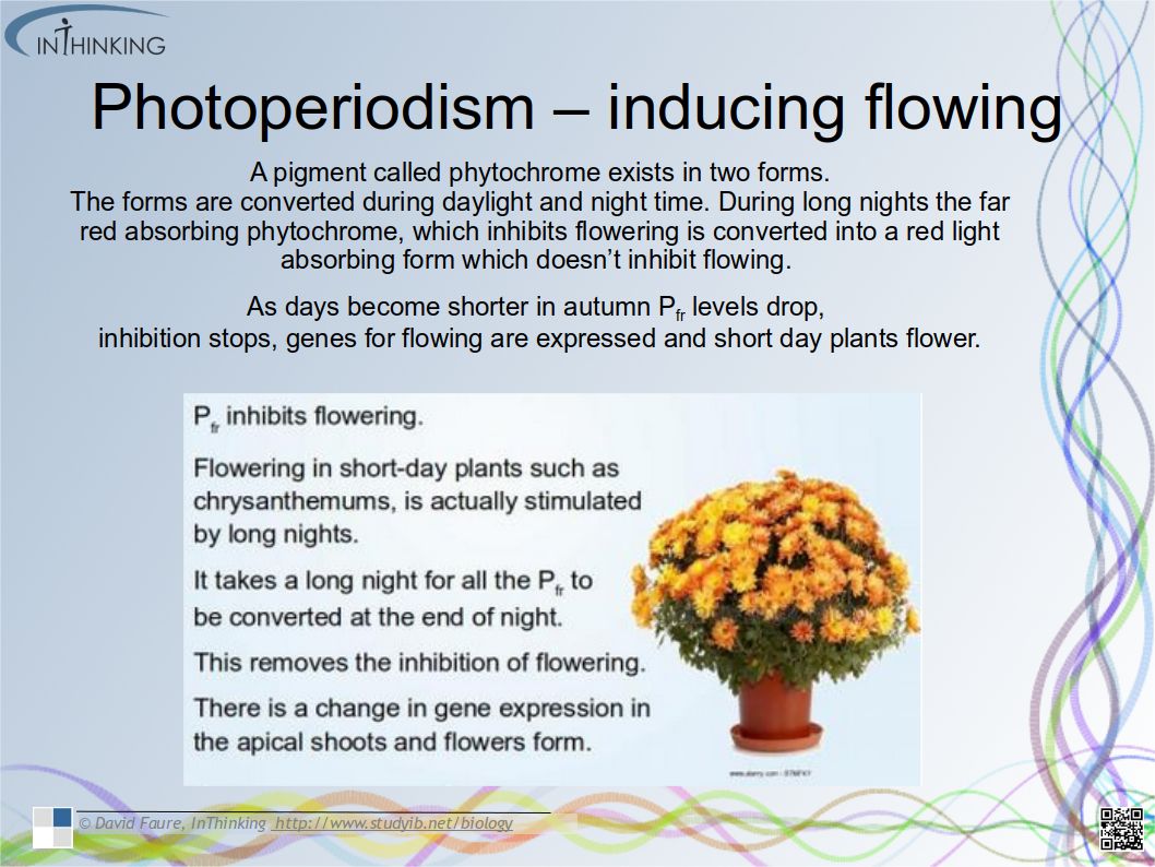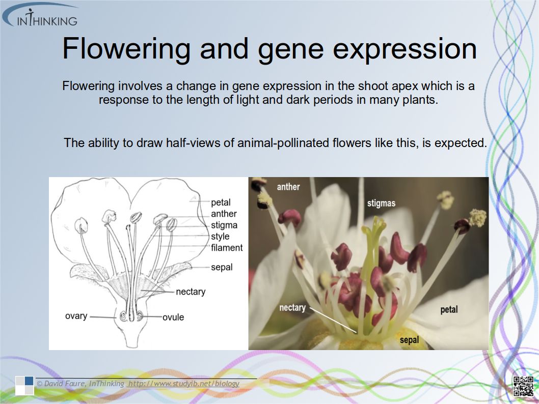 • Flowering involves a change in gene expression in the shoot apex which is a response to the length of light and dark periods in many plants