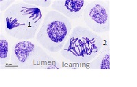 In cell 2, the chromatids are aligned on the equator (seen from above)- Metaphase. In cell 1, the chromatids are moving towards the poles - Anaphase.