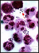 Which process is involved in white blood cells engulfing bacteria (arrowed in the photomicrograph)?