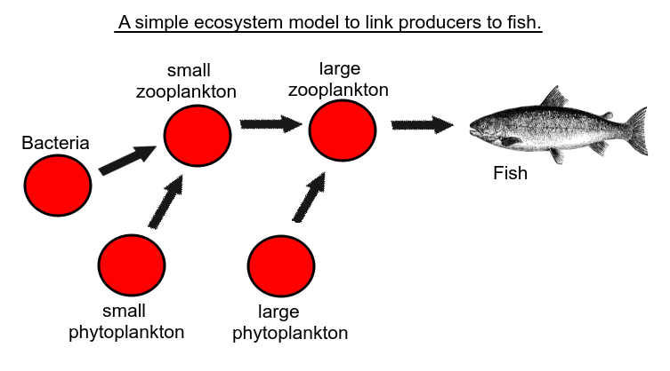 Producers are photosynthetic, primary consumers eat producers, and secondary consumers eat primary consumers. The situation is complicated this this model, because the large zooplankton could be described as a primary consumer or a secondary consumer, because it eats large phytoplankton which is a producer and small zooplankton.