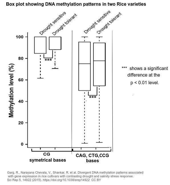 In research geneticists were able to compare methylation in genes thought to be linked with drought tolerance in rice. This graphs shows the methylation levels found.