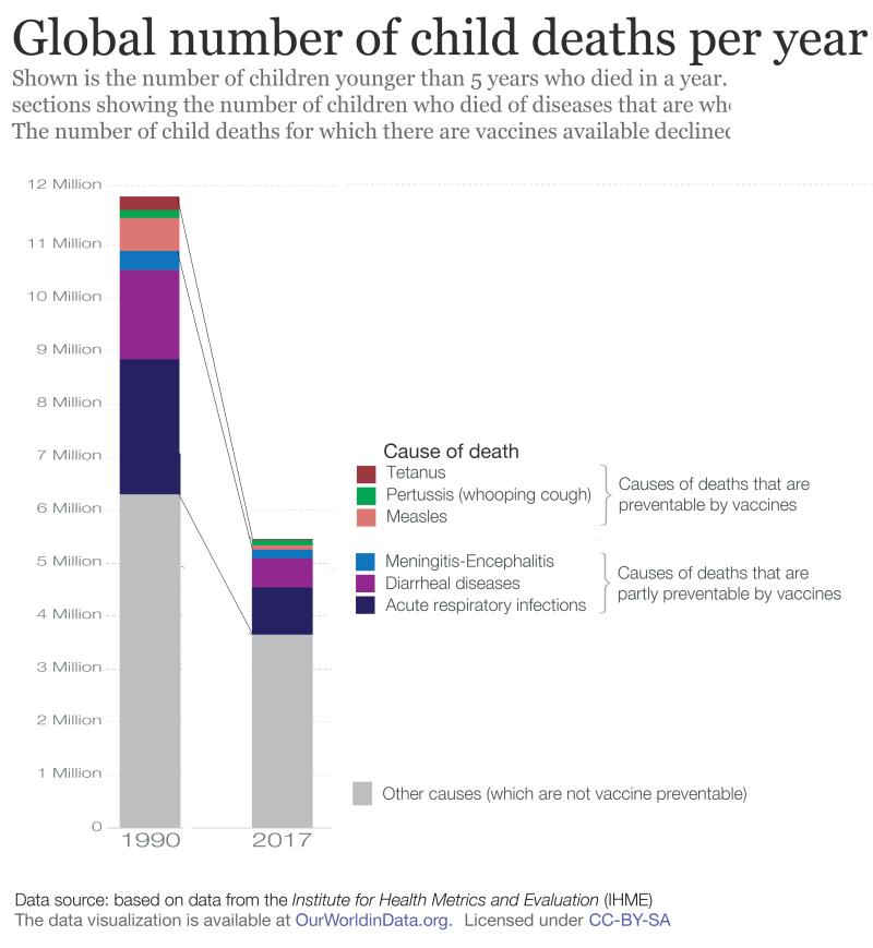 The diagram shows the number of deaths per year for children under five. Three diseases are preventable by vaccines, the grey bar shows numbers for diseases not preventable by vaccines.