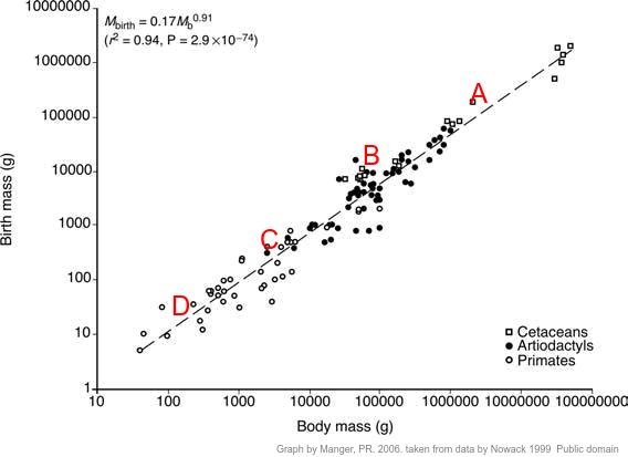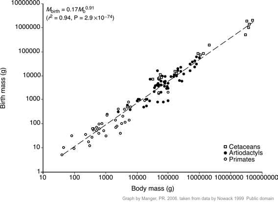 This graph shows a surprisingly good correlation between animal size and the birth size, which could also relate to the more advanced development young at birth in larger mammals.