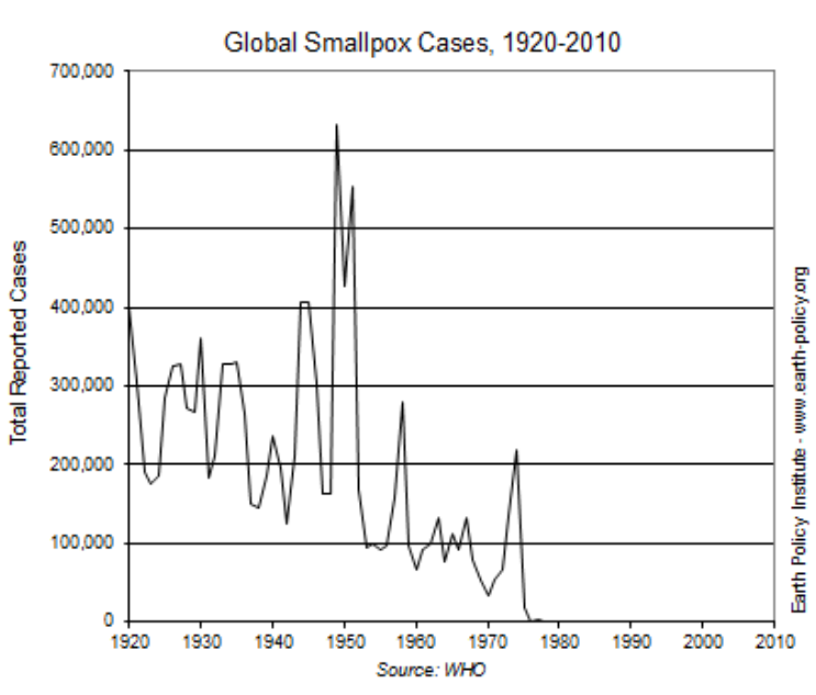 The graph below shows global numbers of smallpox cases between 1920 and 2010.