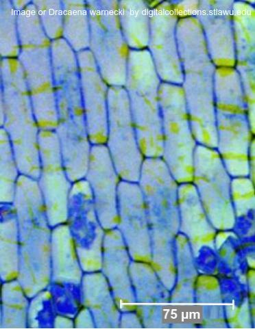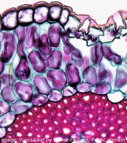The image shows a range of different cell types in the leaf of a Yucca plant.