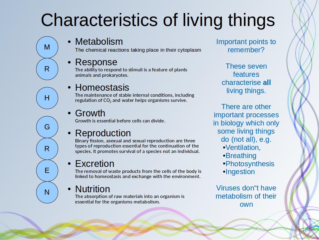 - Identifying the characteristics of living things (Mr H. Gren - metabolism, response, homeostasis, growth, reproduction, excretion & nutrition).