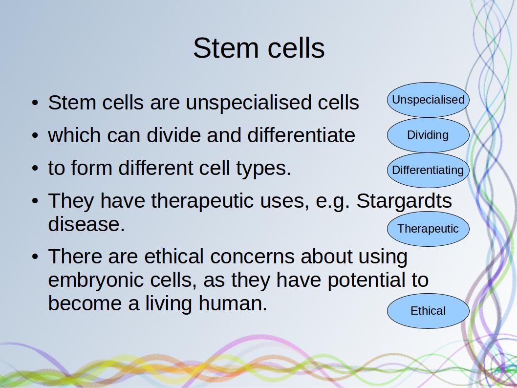 - Stem cells can divide and differentiate along different pathways in embryonic development which makes stem cells useful for therapeutic uses (e.g. Stargardt's disease).