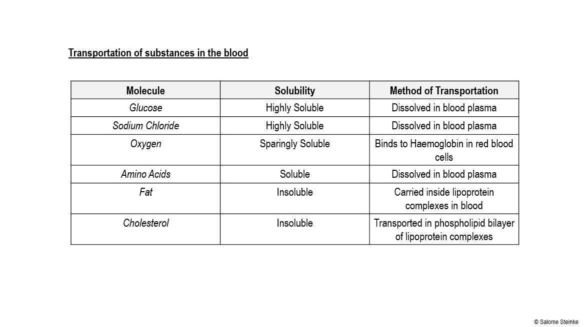 - Compare the solubility of glucose, amino acids, cholesterol, fats, oxygen and sodium chloride in water and link this to the way they are transported.