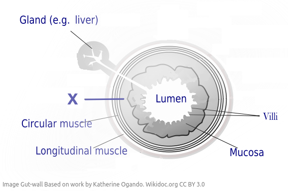 The diagram shows a representation of several layers in the wall of human intestines.