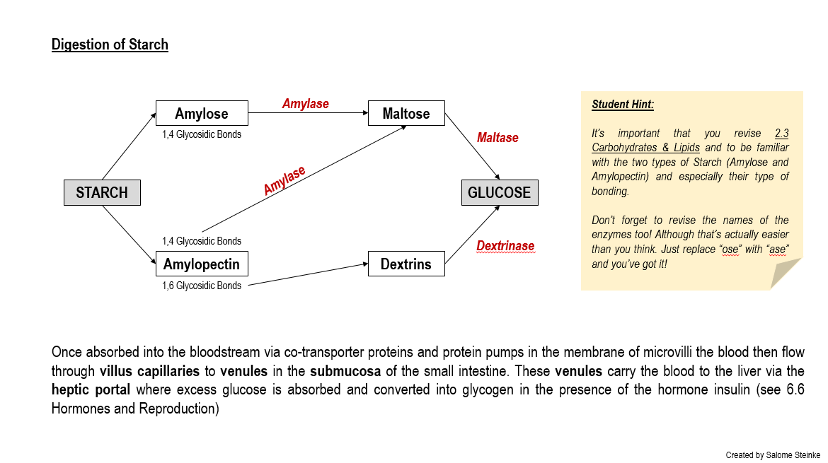 Apply knowledge of the process or digestion and absorption in the small intestine to the digestion of starch and the transport of maltose and glucose to the liver.