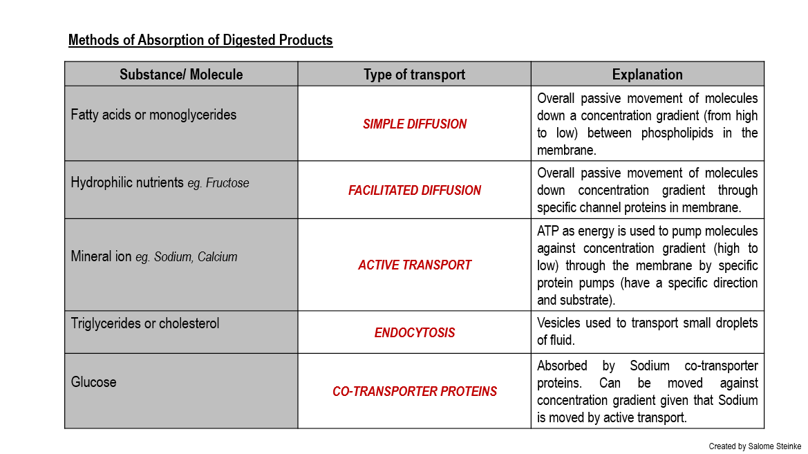 Drag and drop the correct word or phrase into the gap to outline how these molecules are absorbed into the intestinal epithelial cells.