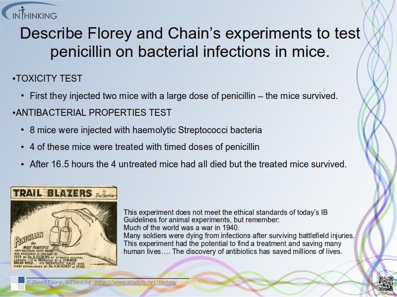 - Describe Florey and Chain’s experiments to test penicillin on bacterial infections in mice.
