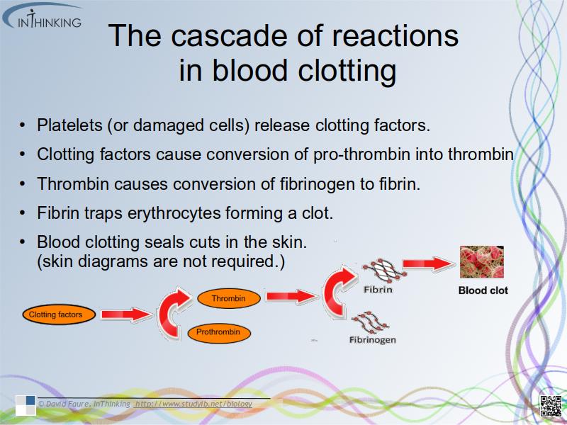 Watch this short video tutorial about the cascade of reactions in blood clotting. Focus on platelets, clotting factors, thrombin, fibrinogen, and fibrin as well as erythrocytes.