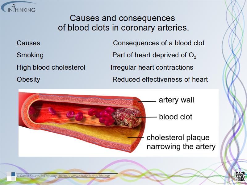 - Outline causes and consequences of blood clot formation in coronary arteries.