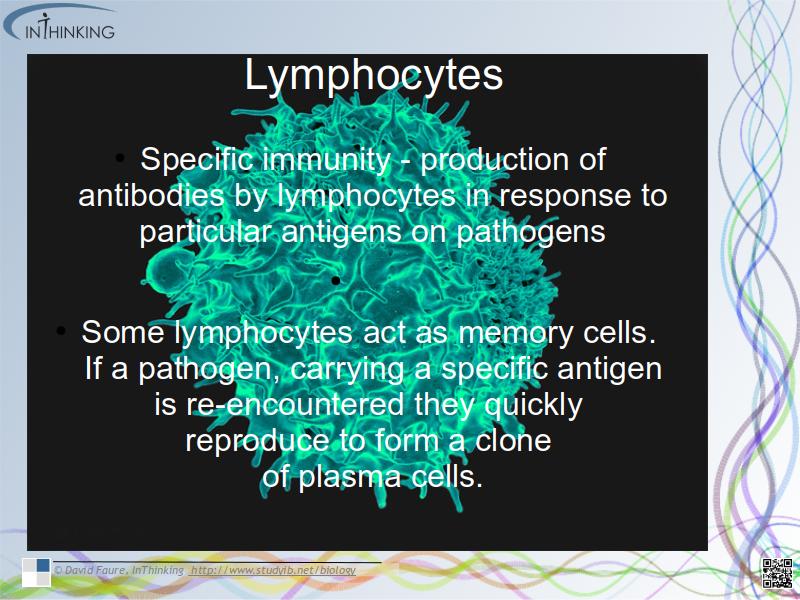 - Subgroups of phagocyte and lymphocyte are not required but students should be aware that some lymphocytes act as memory cells and can quickly reproduce to form a clone of plasma cells if a pathogen carrying a specific antigen is re-encountered.