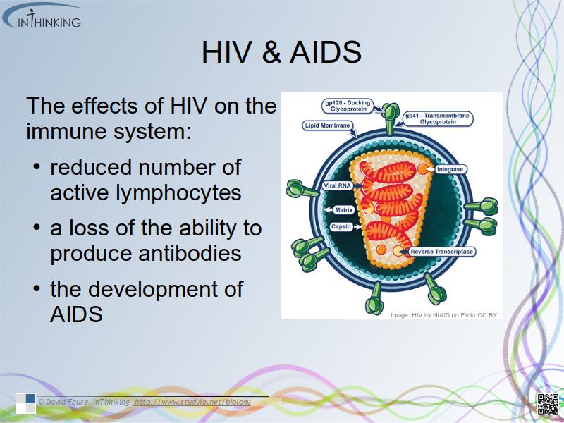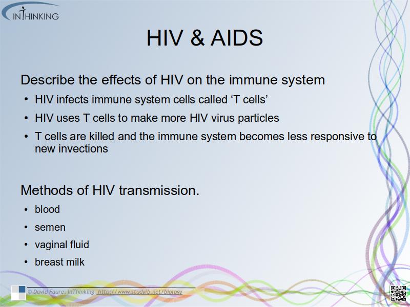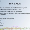 - Describe the effects of HIV on the immune system and methods of transmission.