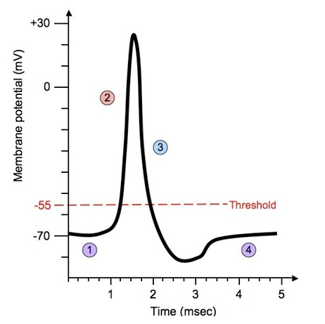axon or dendron. action potential +70 millivolts potential outside active potassium ions -70 millivolts impermeable concentration difference permeable sodium ions uses ATP inside