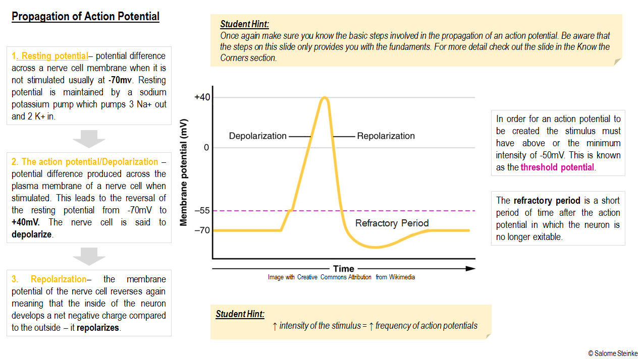 - Action potentials are depolarization and repolarization of the neuron which are propagated along the axons of neurons creating nerve impulses. (Oscilloscope traces showing resting potential & action potential).