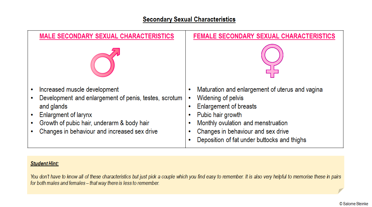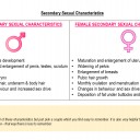 - Estrogen and progesterone cause pre-natal development of female reproductive organs and in puberty the female secondary sexual characteristics.