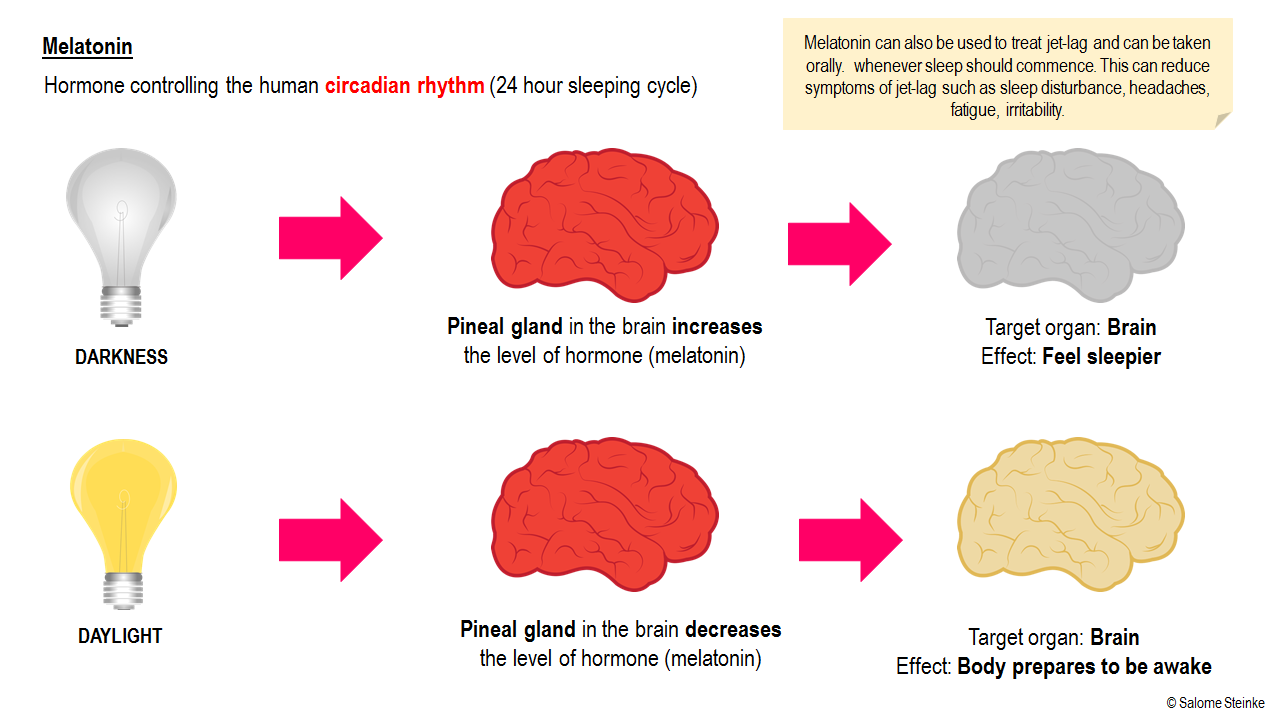- Melatonin controls circadian rhythms (jet lag) (secreted by pineal gland).