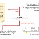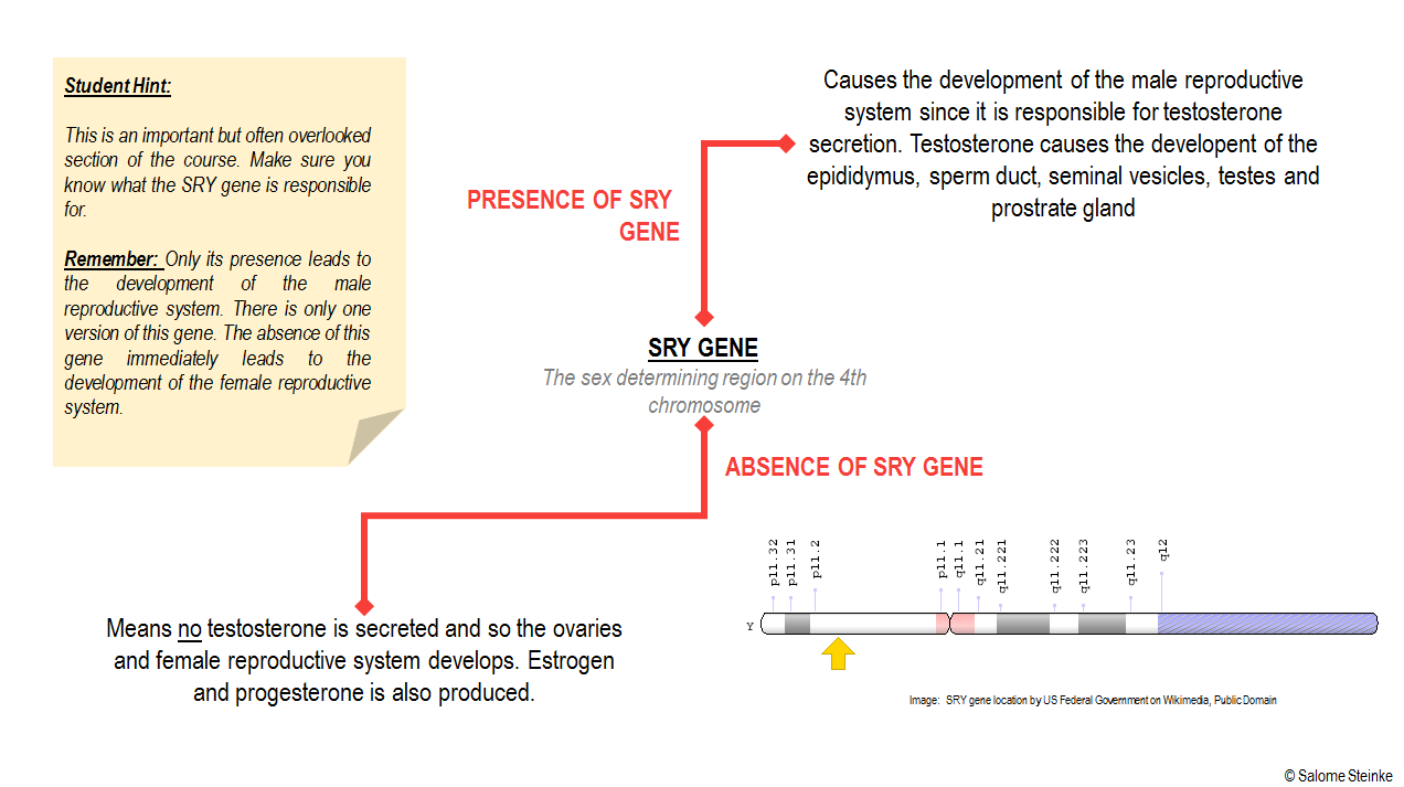 - The sry gene of the Y chromosomes causes embryonic gonads to develop as testes and then they secrete testosterone which causes pre-natal development of male genitalia. In puberty it causes, development of male secondary sexual characteristics and sperm production.