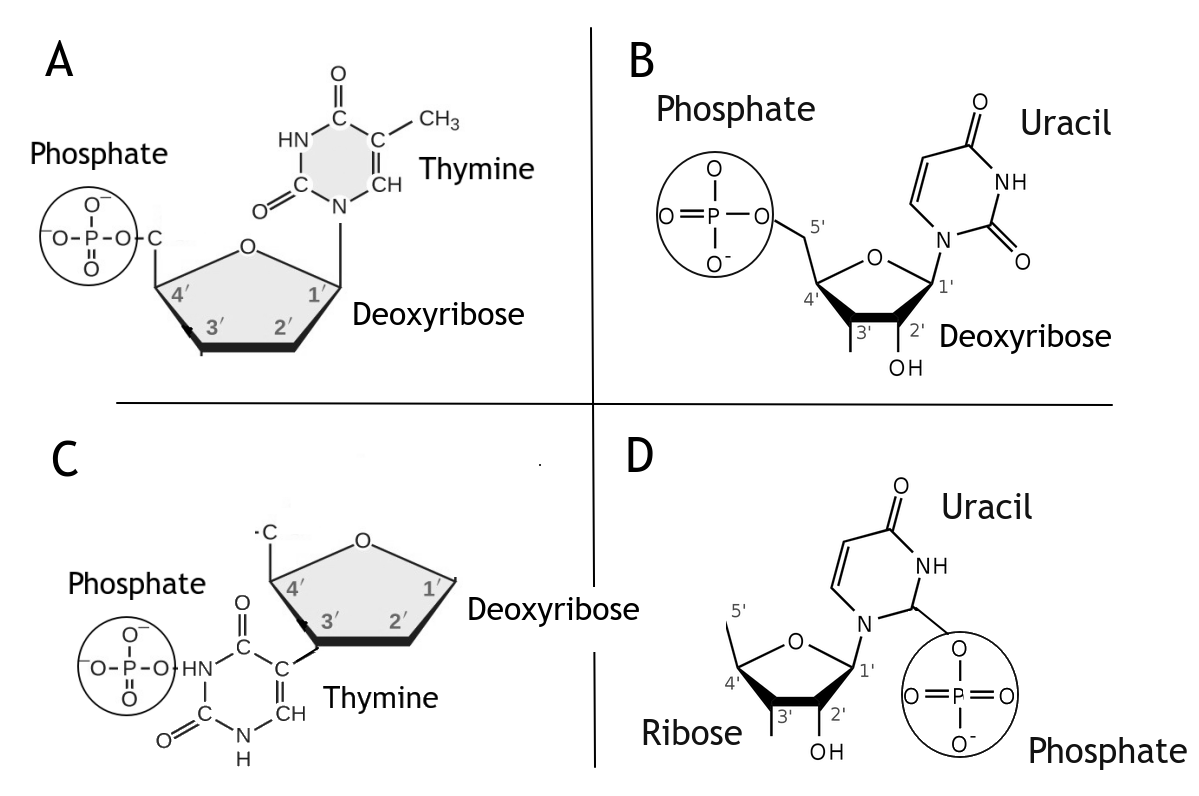- RNA nucleotides are made from phosphate, ribose (pentose sugar) and nucleotide bases (U, A, G, C)